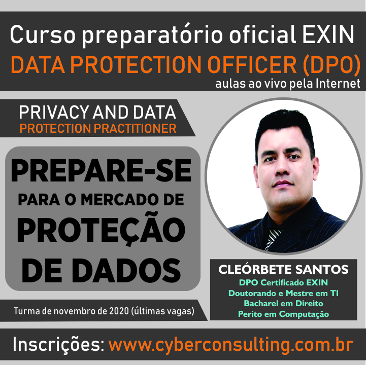 Em novembro de 2020 ministrarei o curso oficial preparatório da EXIN Privacy & Data Protection Practitioner que faz parte da trilha para a certificação em Data Protection Officer (DPO). As inscrições podem ser feitas no www.cyberconsulting.com.br.